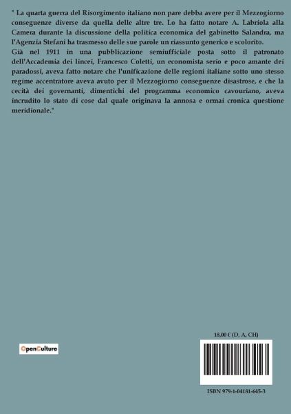 " La quarta guerra del Risorgimento italiano non pare debba avere per il Mezzogiorno conseguenze diverse da quella delle altre tre. Lo ha fatto notare A. Labriola alla Camera durante la discussione della politica economica del gabinetto Salandra, ma l'Agenzia Stefani ha trasmesso delle sue parole un riassunto generico e scolorito. Già nel 1911 in una pubblicazione semiufficiale posta sotto il patronato dell'Accademia dei lincei, Francesco Coletti, un economista serio e poco amante dei paradossi, aveva fatto notare che l'unificazione delle regioni italiane sotto uno stesso regime accentratore aveva avuto per il Mezzogiorno conseguenze disastrose, e che la cecità dei governanti, dimentichi del programma economico cavouriano, aveva incrudito lo stato di cose dal quale originava la annosa e ormai cronica questione meridionale."