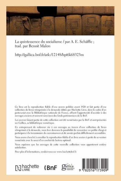 La quintessence du socialisme / par A. E. Schäffle; trad. par Benoit Malon Date de l'édition originale: 1886 Collection: Bibliothèque populaire; 5 Le présent ouvrage s'inscrit dans une politique de conservation patrimoniale des ouvrages de la littérature Française mise en place avec la BNF. HACHETTE LIVRE et la BNF proposent ainsi un catalogue de titres indisponibles, la BNF ayant numérisé ces oeuvres et HACHETTE LIVRE les imprimant à la demande. Certains de ces ouvrages reflètent des courants de pensée caractéristiques de leur époque, mais qui seraient aujourd'hui jugés condamnables. Ils n'en appartiennent pas moins à l'histoire des idées en France et sont susceptibles de présenter un intérêt scientifique ou historique. Le sens de notre démarche éditoriale consiste ainsi à permettre l'accès à ces oeuvres sans pour autant que nous en cautionnions en aucune façon le contenu. Pour plus d'informations, rendez-vous sur www.hachettebnf.fr