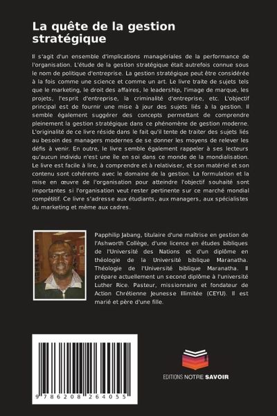 Il s'agit d'un ensemble d'implications managériales de la performance de l'organisation. L'étude de la gestion stratégique était autrefois connue sous le nom de politique d'entreprise. La gestion stratégique peut être considérée à la fois comme une science et comme un art. Le livre traite de sujets tels que le marketing, le droit des affaires, le leadership, l'image de marque, les projets, l'esprit d'entreprise, la criminalité d'entreprise, etc. L'objectif principal est de fournir une mise à jour des sujets liés à la gestion. Il semble également suggérer des concepts permettant de comprendre pleinement la gestion stratégique dans ce phénomène de gestion moderne. L'originalité de ce livre réside dans le fait qu'il tente de traiter des sujets liés au besoin des managers modernes de se donner les moyens de relever les défis à venir. En outre, le livre semble également rappeler à ses lecteurs qu'aucun individu n'est une île en soi dans ce monde de la mondialisation. Le livre est facile à lire, à comprendre et à relativiser, et son matériel et son contenu sont cohérents avec le domaine de la gestion. La formulation et la mise en oeuvre de l'organisation pour atteindre l'objectif souhaité sont importantes si l'organisation veut rester pertinente sur ce marché mondial compétitif. Ce livre s'adresse aux étudiants, aux managers, aux spécialistes du marketing et même aux cadres.