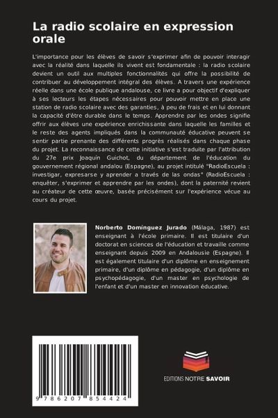 L'importance pour les élèves de savoir s'exprimer afin de pouvoir interagir avec la réalité dans laquelle ils vivent est fondamentale : la radio scolaire devient un outil aux multiples fonctionnalités qui offre la possibilité de contribuer au développement intégral des élèves. A travers une expérience réelle dans une école publique andalouse, ce livre a pour objectif d'expliquer à ses lecteurs les étapes nécessaires pour pouvoir mettre en place une station de radio scolaire avec des garanties, à peu de frais et en lui donnant la capacité d'être durable dans le temps. Apprendre par les ondes signifie offrir aux élèves une expérience enrichissante dans laquelle les familles et le reste des agents impliqués dans la communauté éducative peuvent se sentir partie prenante des différents progrès réalisés dans chaque phase du projet. La reconnaissance de cette initiative s'est traduite par l'attribution du 27e prix Joaquín Guichot, du département de l'éducation du gouvernement régional andalou (Espagne), au projet intitulé "RadioEscuela : investigar, expresarse y aprender a través de las ondas" (RadioEscuela : enquêter, s'exprimer et apprendre par les ondes), dont la paternité revient au créateur de cette oeuvre, basée précisément sur l'expérience vécue au cours du projet.