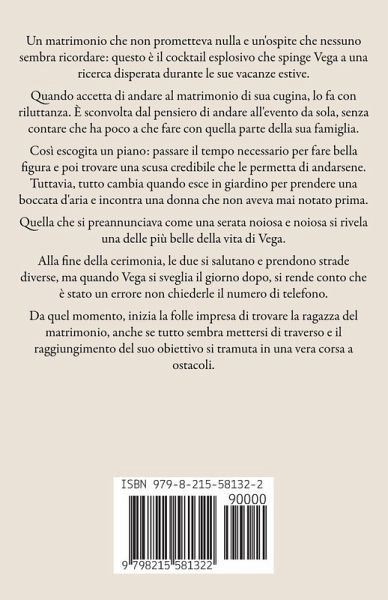Un matrimonio che non prometteva nulla e un'ospite che nessuno sembra ricordare: questo è il cocktail esplosivo che spinge Vega a una ricerca disperata durante le sue vacanze estive. Quando accetta di andare al matrimonio di sua cugina, lo fa con riluttanza. È sconvolta dal pensiero di andare all'evento da sola, senza contare che ha poco a che fare con quella parte della sua famiglia. Così escogita un piano: passare il tempo necessario per fare bella figura e poi trovare una scusa credibile che le permetta di andarsene. Tuttavia, tutto cambia quando esce in giardino per prendere una boccata d'aria e incontra una donna che non aveva mai notato prima. Quella che si preannunciava come una serata noiosa e noiosa si rivela una delle più belle della vita di Vega. Alla fine della cerimonia, le due si salutano e prendono strade diverse, ma quando Vega si sveglia il giorno dopo, si rende conto che è stato un errore non chiederle il numero di telefono. Da quel momento, inizia la folle impresa di trovare la ragazza del matrimonio, anche se tutto sembra mettersi di traverso e il raggiungimento del suo obiettivo si tramuta in una vera corsa a ostacoli.