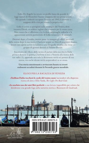 Una storia emozionante e avvincente basata su eventi realmente accaduti durante la Seconda Guerra Mondiale... Lidia De Angelis ha tenuto un profilo basso da quando le leggi razziali di Mussolini l'hanno strappata dal suo primo amore. Ma quando i tedeschi occupano Venezia nel 1943, è costretta a scappare dalla città per salvare la propria vita. Lidia si unisce ai partigiani sulle montagne del Veneto, dove incontra David, un soldato inglese che combatte per la stessa causa. Man mano che si affeziona a lui, le dure rappresaglie tedesche e le appassionate attività patriottiche di Lidia minacciano di separarli. Decenni dopo, a Londra, mentre passa in rassegna gli effetti personali della nonna dopo la sua morte, Charlotte scopre un libro di preghiere ebraico, lettere non aperte scritte in italiano e una fotografia sbiadita che ritrae un gruppo di giovani davanti al Palazzo Ducale. Incuriosita dal rifiuto della nonna di parlare della sua vita in Italia prima e durante la guerra, Charlotte si reca a Venezia alla ricerca delle sue radici. Lì, apprende non solo la devastante verità sul passato di sua nonna, ma anche alcune verità sorprendenti su se stessa. Per fans di Dinah Jefferies, Rosamunde Pilcher e Fiona Valpy ELOGI PER LA RAGAZZA DI VENEZIA Siobhan Daiko toccherà le corde del vostro cuore lasciandovi alla disperata ricerca di altro. Ellie Yarde, The Coffee Pot Book Club. In assoluto uno dei miei libri preferiti e una lettura imperdibile per coloro che desiderano una grande fuga nella narrativa storica. Recensore di Goodreads.