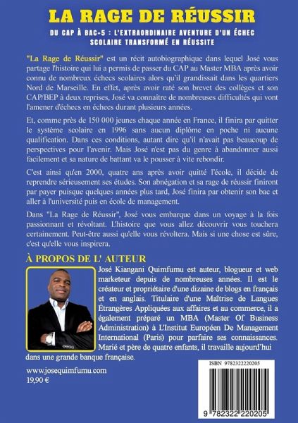 "La Rage de Réussir" est un récit autobiographique dans lequel José vous partage l'histoire qui lui a permis de passer du CAP au Master MBA après avoir connu de nombreux échecs scolaires et quelques petites galères alors qu'il grandissait dans les quartiers Nord de Marseille. En effet, après avoir raté son brevet des collèges et son CAP/BEP à deux reprises, José va connaître de nombreuses difficultés qui vont l'amener d'échecs en échecs durant plusieurs années. Et, comme près de 150 000 jeunes chaque année en France, il finira par quitter le système scolaire en 1996 sans aucun diplôme en poche ni aucune qualification. Dans ces conditions, autant dire qu'il n'avait pas beaucoup de perspectives pour l'avenir. Mais José n'est pas du genre à abandonner aussi facilement et sa nature de battant va le pousser à vite rebondir. C'est ainsi qu'au début des années 2000, quatre ans après avoir quitté l'école, il prend pleinement conscience de ses propres capacités et décide de reprendre sérieusement ses études. Son abnégation et sa rage de réussir finiront par payer puisque quelques années plus tard, alors que tout semblait perdu d'avance, José finira par décrocher son bac et aller à l'université puis en école de management. Dans "La Rage de Réussir", José vous embarque dans un voyage à la fois passionnant et révoltant. L'histoire que vous allez découvrir vous touchera certainement. Peut-être aussi qu'elle vous révoltera ou vous motivera. Mais si une chose est sûre, c'est qu'elle vous inspirera.