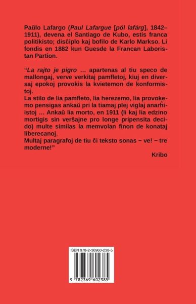 La rajto je pigro apartenas al tiu speco de mallongaj, verve verkitaj pamfletoj, kiuj en diversaj epokoj provokis la kvietemon de la konformistoj. La ätoro, Paulo Lafargo (Paul Lafargue), devena el Santiago de Kubo, bofilo de Karlo Markso, kunkreinto de la franca laborista partio, estas konsiderata kiel franca marksano; li agadis kune kun Jules Guesde. La stilo de lia pamfleto, lia herezemo, lia provokemo pensigas ankä pri la tiamaj plej viglaj anar¿iistoj. Ankä lia morto, en 1911 (li kaj lia edzino mortigis sin ver¿ajne pro longe pripensita decido) multe similas la memvolan finon de konataj liberecanoj. (Kribo)