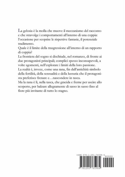 La gelosia è la molla che muove il meccanismo del racconto e che stravolge i comportamenti all'interno di una coppia: l'occasione per scoprire le rispettive fantasie, il potenziale tradimento. Quale è il limite della trasgressione all'interno di un rapporto di coppia? La frontiera del sogno si dischiude, nel romanzo, di fronte ai due protagonisti principali; complici spesso inconsapevoli, a volte sgomenti, nell'esplorare i limiti della loro passione. La realtà è come una rana, fin dall'antichità simbolo della fertilità, della sensualità e della lussuria che il protagonista preferisce frenare e...nascondere in tasca. Ma la rana è lì, nella tasca, che gracida e freme per uscire allo scoperto, per balzare allegramente di sasso in sasso fino al fiore più invitante di tutto lo stagno.