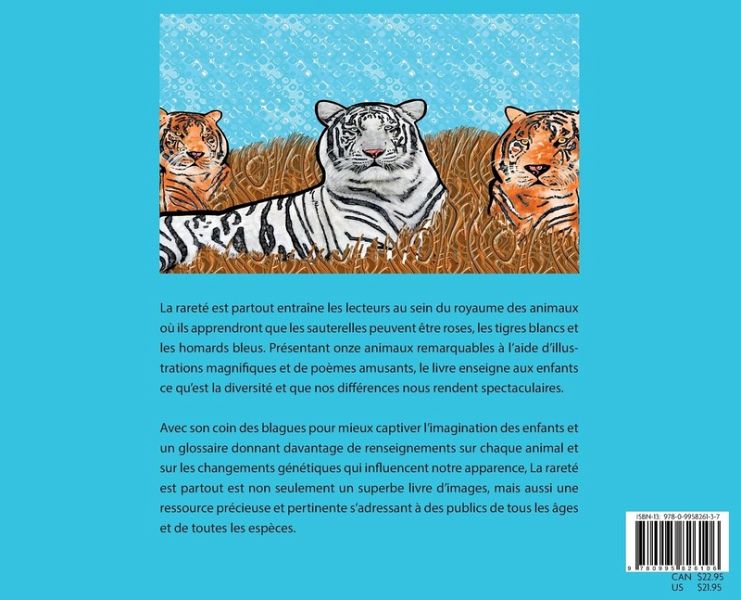 La rareté est partout entraîne les lecteurs au sein du royaume des animaux où ils apprendront que les sauterelles peuvent être roses, les tigres blancs et les homards bleus. Présentant onze animaux remarquables à l'aide d'illustrations magnifiques et de poèmes amusants, le livre enseigne aux enfants ce qu'est la diversité et que nos différences nous rendent spectaculaires. Avec son coin des blagues pour mieux captiver l'imagination des enfants et un glossaire donnant davantage de renseignements sur chaque animal et sur les changements génétiques qui influencent notre apparence, La rareté est partout est non seulement un superbe livre d'images, mais aussi une ressource précieuse et pertinente s'adressant à des publics de tous les âges et de toutes les espèces.