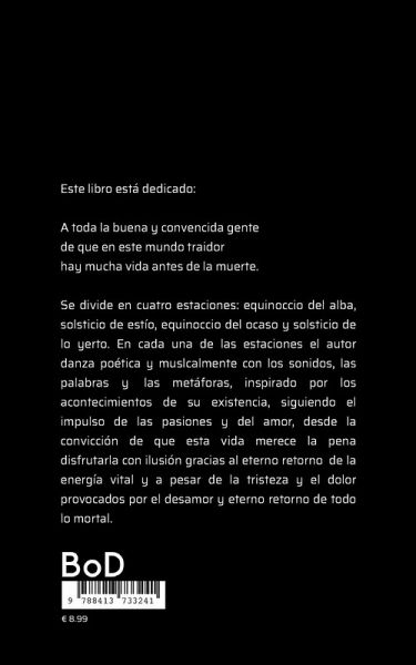 Este libro está dedicado: A toda la buena y convencida gente de que en este mundo traidor hay mucha vida antes de la muerte. Se divide en cuatro estaciones: equinoccio del alba, solsticio de estío, equinoccio del ocaso y solsticio de lo yerto. En cada una de las estaciones el autor danza poética y musicalmente con los sonidos, las palabras y con las metáforas, inspirado por los acontecimientos de su existencia, siguiendo el impulso de las pasiones y del amor, desde la convicción de que esta vida vida merece la pena disfrutarla con ilusión gracias al eterno retorno de la energía vital y a pesar de la tristeza y el dolor provocados por el desamor y el eterno retorno de todo lo mortal.