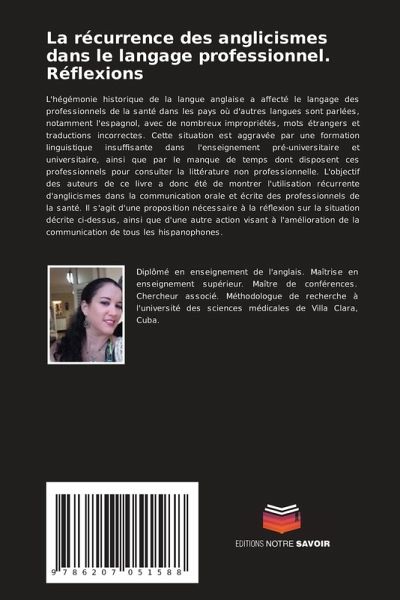 L'hégémonie historique de la langue anglaise a affecté le langage des professionnels de la santé dans les pays où d'autres langues sont parlées, notamment l'espagnol, avec de nombreux impropriétés, mots étrangers et traductions incorrectes. Cette situation est aggravée par une formation linguistique insuffisante dans l'enseignement pré-universitaire et universitaire, ainsi que par le manque de temps dont disposent ces professionnels pour consulter la littérature non professionnelle. L'objectif des auteurs de ce livre a donc été de montrer l'utilisation récurrente d'anglicismes dans la communication orale et écrite des professionnels de la santé. Il s'agit d'une proposition nécessaire à la réflexion sur la situation décrite ci-dessus, ainsi que d'une autre action visant à l'amélioration de la communication de tous les hispanophones.