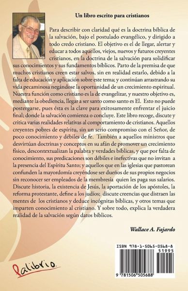 Un libro escrito para cristianos Para describir con claridad qué es la doctrina bíblica de la salvación, bajo el postulado evangélico, y dirigido a todo credo cristiano. El objetivo es el de llegar, alertar y educar a todos aquellos, viejos, nuevos y futuros creyentes cristianos, en la doctrina de la salvación para solidificar sus conocimientos y sus fundamentos bíblicos. Parto de la premisa de que muchos cristianos creen estar salvos, sin en realidad estarlo, debido a la falta de educación y aplicación sobre este tema; y continúan arrastrando su vida pecaminosa negándose la oportunidad de un crecimiento espiritual. Nuestra función como cristiano es la de evangelizar, y nuestro objetivo es, mediante la obediencia, llegar a ser santo como santo es El. Esto no puede postergarse, pues ésta es la clave para exitosamente enfrentar el juicio final; donde la salvación comienza o concluye. Este libro recoge, discute y critica varias realidades relativas al comportamiento de cristianos. Aquellos creyentes pobres de espíritu, sin un serio compromiso con el Señor, de poco conocimiento y débiles de fe. También a aquellos ministros que desvirtúan doctrinas y conceptos en su afán de promover un crecimiento físico, descontextualizan la palabra y verdades bíblicas, y que por falta de conocimiento, sus predicaciones son débiles e inefectivas que no invitan a la presencia del Espíritu Santo; y aquellos que en las iglesias que pastorean confunden la mayordomía creyéndose ser dueños de sus propios negocios sin reconocer ser empleados de la membresía quien les paga sus salarios. Discute historia, la existencia de Jesús, la aportación de los apóstoles, la reforma protestante, define a los judíos; discute creencias que distraen las mentes de los cristianos y deduce incógnitas bíblicas, y otros temas que imparten conocimiento al cristiano. Y sobre todo, explica la verdadera realidad de la salvación según datos bíblicos. Wallace A. Fajardo
