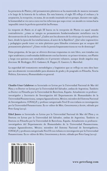 Claudio César Calabrese & Ethel Junco: Introducción - Federico Nassim Bravo: Popper y Platón: la justicia en tiempos de la democracia imperial - Claudio César Calabrese: Heidegger y el símil de la caverna. Los supuestos de su Interpretación - Gustavo Esparza: Las raíces pedagógicas de la Apología de Sócrates. Influencias platónicas en la filosofía del exilio de E.¿Cassirer (1933-1945) - Silvana Filippi: Heidegger, la metafísica de Platón y el desconcierto posmoderno - Ethel Junco: Platonismo en la poesía argentina del siglo XX: Leopoldo Marechal, un demiurgo del sur - María Teresa Padilla Longoria: Hans-Georg Gadamer, un platónico del siglo XX: la dialéctica como ejercicio de racionalidad dialógica - Ángel Xolocotzi Yáñez: La invención del fundamento. La recepción heideggeriana de Platón - Claudio César Calabrese & Ethel Junco: La recepción de Platón en dos filósofos cristianos: Josef Pieper y Michele Federico Sciacca - Biografías de los autores.