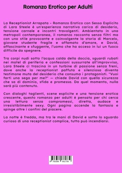 La Receptionist Arrapata - Romanzo Erotico con Sesso Esplicito di Lara Steele è un'esperienza narrativa carica di desiderio, tensione carnale e incontri travolgenti. Ambientato in una metropoli contemporanea, il romanzo racconta senza filtri ma con uno stile provocante e coinvolgente la storia di Marcelo, giovane studente fragile e affamato d'amore, e David, affascinante e sfuggente, l'uomo che ha acceso in lui un fuoco difficile da spegnere.Tra corpi nudi sotto l'acqua calda della doccia, sguardi rubati nei motel di periferia e confessioni sussurrate all'improvviso, Lara Steele ci trascina in un turbine di passione senza freni, dove anche la receptionist paffuta e silenziosa diventa testimone muta del desiderio che consuma i protagonisti. "Vuoi farti una sega per me?" - chiede David con quella sicurezza che sa di dominio, sfida e promessa. Da quel momento, nulla sarà più contenuto.Con dialoghi taglienti, scene esplicite e una tensione erotica crescente, questo romanzo per adultiè pensato per chi cerca una lettura senza compromessi, diretta, audace e irresistibilmente sexy. Ogni pagina accende la fantasia e spinge oltre i confini del piacere.La notte è fredda, ma tra le mani di David e sotto lo sguardo curioso di una receptionist complice, tutto può incendiarsi.