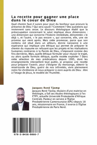 Quel chemin faut-il suivre pour jouir du bonheur que procure la présence de Dieu ? Qui sera sauvé ? Comment ? Des questions qui reviennent sans cesse. Le discours théologique établi que la préoccupation concernant le salut implique deux dimensions : une dimension qui concerne l histoire immédiate, dénommée " le déjà ", et l autre, " le pas encore ", qui concerne, elle, une vie promise qui vient après. Mais cette promesse, parce que son contenu est situé dans un ailleurs, donne naissance à une espérance qui implique une éthique qui permet de préparer le chemin du royaume en refusant que les projets et les réalisations humaines contraires à la Parole de Dieu, s imposent comme des fins dernières. Mais, quelle éthique formuler pour réussir le trajet, ou alors quelle formule éthique, quelle recette exploiter ? Dans cette sélection de mes prédications depuis 1995, dont les enseignements interpellent tout public, je propose une recette pour préparer l avenir, pour s éloigner du mensonge, obtenir la miséricorde de Dieu, guérir de nos infirmités, vivre pleinement notre foi chrétienne et nous préparer à vivre auprès de Dieu : être à l image de Jésus, le modèle de l humilité.