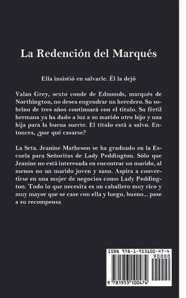 Ella insistió en salvarle. Él la dejó. Valan Grey, sexto conde de Edmonds, marqués de Northington, no desea engendrar un heredero. Su sobrino de tres años continuará con el título. Su fértil hermana ya ha dado a luz a su marido otro hijo y una hija para la buena suerte. El título está a salvo. Entonces, ¿por qué casarse? La Srta. Jeanine Matheson se ha graduado en la Escuela para Señoritas de Lady Peddington. Sólo que Jeanine no está interesada en encontrar un marido, al menos no un marido joven y sano. Aspira a convertirse en una mujer de negocios como Lady Peddington. Todo lo que necesita es un caballero muy rico y muy mayor que se case con ella y luego, bueno... pase a su recompensa.