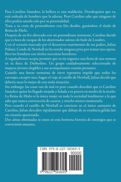 Para Caroline Saunders, la belleza es una maldición. Dondequiera que va, está rodeada de hombres que la adoran. Pero Caroline sabe que ninguno de ellos podría amarla solo por su personalidad. Trata a su corte de pretendientes con frío desdén, ganándose el título de Reina de Hielo. Después de un feo altercado con un pretendiente insistente, Caroline decide que es hora de escapar de los abarrotados salones de baile de Londres. Con el corazón marcado por el desastroso matrimonio de sus padres, Julian Palmer, Conde de Newhall no ha tenido ninguna prisa por tomar una esposa. Pero los hombres con títulos necesitan herederos. A regañadientes acepta permitir que su tía organice una fiesta de una semana en su finca de Derbyshire. Un grupo cuidadosamente seleccionado de mujeres jóvenes elegibles y sus acompañantes estarán presentes. Cuando una fuerte tormenta de nieve repentina impide que todos los carruajes, excepto uno, hagan el viaje al castillo de Newhall, Julian decide que debería sacar lo mejor de una mala situación. Sin embargo, las cosas van de mal en peor cuando descubre que es Caroline Saunders quien ha llegado mojada y helada a su puerta en medio de la noche. La Reina de Hielo es la única mujer en toda la sociedad londinense a la que sabe que nunca convencería de casarse, y mucho menos enamorarla. Pero cuando el castillo de Newhall se convierte en el único santuario de Caroline, Julian descubre rápidamente que debajo de su conducta gélida late un corazón apasionado. Dos almas obstinadas se unen en esta hermosa historia de enemigos que se convertirán amantes.