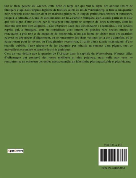 Sur le flanc gauche du Graben, cette belle et large rue qui suit la ligne des anciens fossés de Stuttgard et qui fait l¿orgueil légitime de tous les sujets du roi de Wurtemberg, se trouve un quartier noir et peuplé outre mesure, dont les maisons grimpent, le long de petites rues étroites et tortueuses, jusqüà la cathédrale. Dans les dictionnaires, on lit, à l¿article Stuttgard, que la seule partie de la ville qui soit digne d¿être visitée par le voyageur intelligent se compose de deux faubourgs, dont les maisons sont fort bien alignées. Il faut respecter l¿avis des dictionnaires ; néanmoins, il est certains esprits qui, à Stuttgard, tout en considérant avec intérêt les grandes rues neuves ornées de restaurants à prix fixe et de magasins de bonneterie, n¿ont pas honte de visiter aussi ces quartiers pauvres et dépourvus d¿alignement, où se rencontrent les chers vestiges de la vie d¿autrefois, où le passé renaît pour le rêveur, où l¿imagination reconstruit, à l¿aide d¿une façade chancelante, d¿une tourelle oubliée, d¿une girouette de fer épargnée par miracle au sommet d¿un pignon, tout ce merveilleux et sombre ensemble des cités gothiques. C¿est un vrai dédale que le quartier de l¿Abbaye dans la capitale du Wurtemberg. D¿autres villes d¿Allemagne ont conservé des restes meilleurs et plus précieux, mais nulle part vous ne rencontreriez un écheveau de ruelles mieux emmêlé, un labyrinthe plus inextricable et plus bizarre.