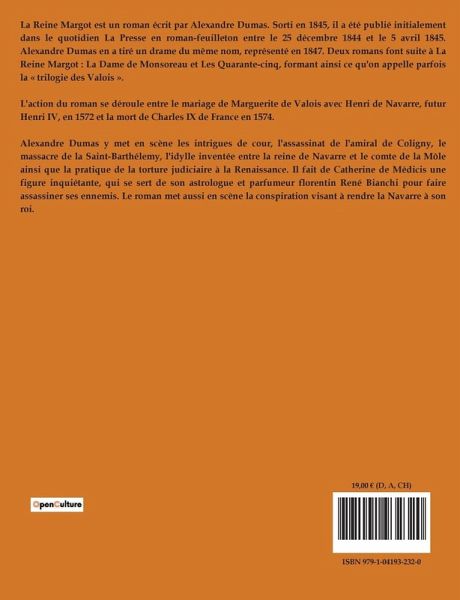 "La Reine Margot" d'Alexandre Dumas plonge le lecteur dans les intrigues politiques et amoureuses de la cour de France à la fin du XVIe siècle. Le récit débute avec le mariage de Marguerite de Valois, surnommée Margot, avec Henri de Navarre, un mariage arrangé pour apaiser les tensions entre catholiques et protestants. Cependant, ce mariage est loin d'être une simple union politique. Marguerite, bien que mariée, entretient une relation avec le duc de Guise, un des chefs catholiques. De son côté, Henri de Navarre est attiré par la belle Charlotte de Sauve, une dame de la cour. Les deux époux, bien que liés par le mariage, poursuivent leurs propres intérêts et alliances. Le roman explore les jeux de pouvoir, les trahisons et les alliances secrètes qui caractérisent cette période tumultueuse de l'histoire de France. Les personnages naviguent dans un environnement où chaque geste et chaque parole peuvent avoir des conséquences fatales. Dumas, avec son style narratif fluide, dépeint une époque où l'amour et la politique sont inextricablement liés, et où les protagonistes doivent constamment choisir entre leurs désirs personnels et leurs devoirs politiques.