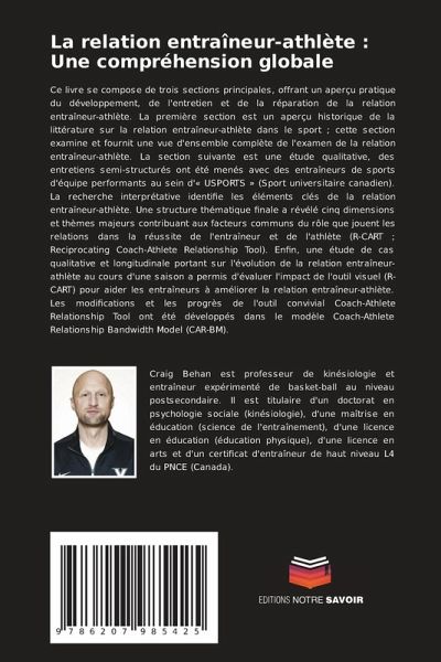 Ce livre se compose de trois sections principales, offrant un aperçu pratique du développement, de l'entretien et de la réparation de la relation entraîneur-athlète. La première section est un aperçu historique de la littérature sur la relation entraîneur-athlète dans le sport ; cette section examine et fournit une vue d'ensemble complète de l'examen de la relation entraîneur-athlète. La section suivante est une étude qualitative, des entretiens semi-structurés ont été menés avec des entraîneurs de sports d'équipe performants au sein d'« USPORTS » (Sport universitaire canadien). La recherche interprétative identifie les éléments clés de la relation entraîneur-athlète. Une structure thématique finale a révélé cinq dimensions et thèmes majeurs contribuant aux facteurs communs du rôle que jouent les relations dans la réussite de l'entraîneur et de l'athlète (R-CART ; Reciprocating Coach-Athlete Relationship Tool). Enfin, une étude de cas qualitative et longitudinale portant sur l'évolution de la relation entraîneur-athlète au cours d'une saison a permis d'évaluer l'impact de l'outil visuel (R-CART) pour aider les entraîneurs à améliorer la relation entraîneur-athlète. Les modifications et les progrès de l'outil convivial Coach-Athlete Relationship Tool ont été développés dans le modèle Coach-Athlete Relationship Bandwidth Model (CAR-BM).