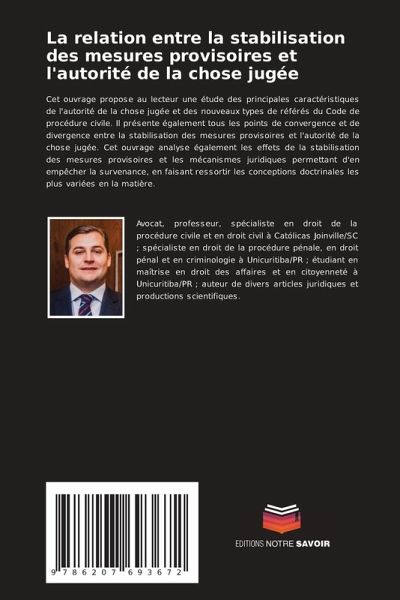 Cet ouvrage propose au lecteur une étude des principales caractéristiques de l'autorité de la chose jugée et des nouveaux types de référés du Code de procédure civile. Il présente également tous les points de convergence et de divergence entre la stabilisation des mesures provisoires et l'autorité de la chose jugée. Cet ouvrage analyse également les effets de la stabilisation des mesures provisoires et les mécanismes juridiques permettant d'en empêcher la survenance, en faisant ressortir les conceptions doctrinales les plus variées en la matière.