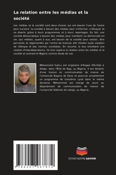 Les médias et la société sont deux choses qui ont besoin l'une de l'autre pour survivre. La société a besoin des médias pour s'informer, s'éduquer et se divertir grâce à leurs programmes et à leurs reportages. En fait, une société démocratique a besoin des médias pour maintenir sa démocratie en vie. Les médias, quant à eux, ont besoin de la société pour exister, être parrainés et réglementés par l'octroi de licences afin d'éviter toute violation de l'éthique et des normes sociétales. En résumé, le duo entretient une relation d'interdépendance. Ce livre explore la relation entre les médias et la société en prenant le Nigeria comme étude de cas.