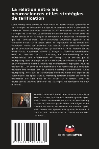 Cette monographie comble le fossé entre les neurosciences appliquées et les stratégies de tarification. Il s'agit de la première étude à condenser la littérature neuroscientifique appliquée et les implications en matière de stratégies de tarification. Le document met en évidence la relation entre les neurosciences et les stratégies de tarification. Il explique les améliorations que les connaissances neuroscientifiques pourraient apporter à la tarification basée sur la valeur. Enfin, les implications et les limites des recherches futures sont discutées. Les résultats de la recherche montrent que la tarification neurologique n'est pratiquement jamais abordée par les universitaires. Cependant, l'auteur a analysé la recherche fondamentale dans les domaines de la tarification, du neuromarketing et des neurosciences afin d'appréhender ce concept. Il en ressort que le neuropricing reste un gadget et qu'il n'existe pas de consensus clair parmi les professionnels quant à l'intérêt des neurosciences appliquées pour les entreprises. D'un point de vue académique, des recherches plus concrètes devraient être menées afin de produire davantage d'informations sur le neuropricing. Alors que les scientifiques devraient mener des expériences académiques, les spécialistes du marketing devraient élaborer des modèles exploitables sur cette base et les tester sur le terrain. Enfin, les neurosciences peuvent améliorer les stratégies de tarification de deux manières...
