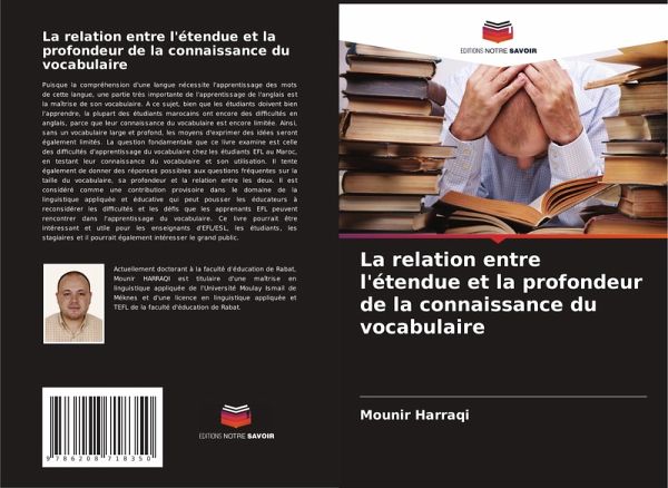 Puisque la compréhension d'une langue nécessite l'apprentissage des mots de cette langue, une partie très importante de l'apprentissage de l'anglais est la maîtrise de son vocabulaire. A ce sujet, bien que les étudiants doivent bien l'apprendre, la plupart des étudiants marocains ont encore des difficultés en anglais, parce que leur connaissance du vocabulaire est encore limitée. Ainsi, sans un vocabulaire large et profond, les moyens d'exprimer des idées seront également limités. La question fondamentale que ce livre examine est celle des difficultés d'apprentissage du vocabulaire chez les étudiants EFL au Maroc, en testant leur connaissance du vocabulaire et son utilisation. Il tente également de donner des réponses possibles aux questions fréquentes sur la taille du vocabulaire, sa profondeur et la relation entre les deux. Il est considéré comme une contribution provisoire dans le domaine de la linguistique appliquée et éducative qui peut pousser les éducateurs à reconsidérer les difficultés et les défis que les apprenants EFL peuvent rencontrer dans l'apprentissage du vocabulaire. Ce livre pourrait être intéressant et utile pour les enseignants d'EFL/ESL, les étudiants, les stagiaires et il pourrait également intéresser le grand public.