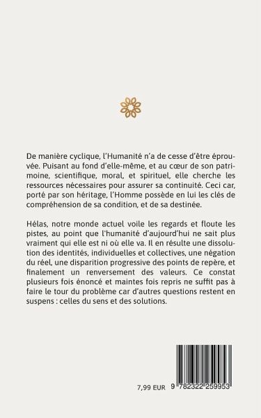 De manière cyclique, l'Humanité n'a de cesse d'être éprouvée. Puisant au fond d'elle-même, et au coeur de son patrimoine, scientifique, moral, et spirituel, elle cherche les ressources nécessaires pour assurer sa continuité. Ceci car, porté par son héritage, l'Homme possède en lui les clés de compréhension de sa condition, et de sa destinée.Hélas, notre monde actuel voile les regards et floute les pistes, au point que l'humanité d'aujourd'hui ne sait plus vraiment qui elle est ni où elle va. Il en résulte une dissolution des identités, individuelles et collectives, une négation du réel, une disparition progressive des points de repère, et finalement un renversement des valeurs. Ce constat plusieurs fois énoncé et maintes fois repris ne suffit pas à faire le tour du problème car d'autres questions restent en suspens : celles du sens et des solutions.