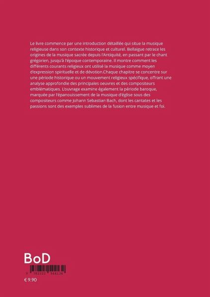 Le livre commence par une introduction détaillée qui situe la musique religieuse dans son contexte historique et culturel. Bellaigue retrace les origines de la musique sacrée depuis l'Antiquité, en passant par le chant grégorien, jusqu'à l'époque contemporaine. Il montre comment les différents courants religieux ont utilisé la musique comme moyen d'expression spirituelle et de dévotion. Chaque chapitre se concentre sur une période historique ou un mouvement religieux spécifique, offrant une analyse approfondie des principales oeuvres et des compositeurs emblématiques. Bellaigue explore la musique liturgique du Moyen Âge, en mettant en lumière l'importance du chant grégorien et son rôle dans les offices religieux. Il poursuit avec la Renaissance, où la polyphonie a pris une place prépondérante dans les compositions sacrées, influençant des compositeurs tels que Palestrina et Josquin des Prés. L'ouvrage examine également la période baroque, marquée par l'épanouissement de la musique d'église sous des compositeurs comme Johann Sebastian Bach, dont les cantates et les passions sont des exemples sublimes de la fusion entre la musique et la foi. Bellaigue met en lumière comment la musique baroque, avec son expressivité et sa complexité, a servi de vecteur pour les émotions religieuses. Le romantisme, avec des figures comme Franz Schubert et Felix Mendelssohn, est présenté comme une période où la musique religieuse a pris une dimension plus personnelle et introspective, reflétant les luttes spirituelles et les aspirations des compositeurs. Bellaigue analyse également la musique sacrée du XIXe siècle, y compris les oeuvres de compositeurs comme César Franck et Anton Bruckner, qui ont cherché à renouer avec les traditions tout en explorant de nouvelles voies expressives. L'auteur ne se limite pas aux traditions chrétiennes et inclut des discussions sur la musique religieuse d'autres cultures et religions. Il examine les chants et les rituels musicaux du judaïsme, de l'islam et d'autres religions, soulignant l'universalité de la musique comme moyen de connexion spirituelle.