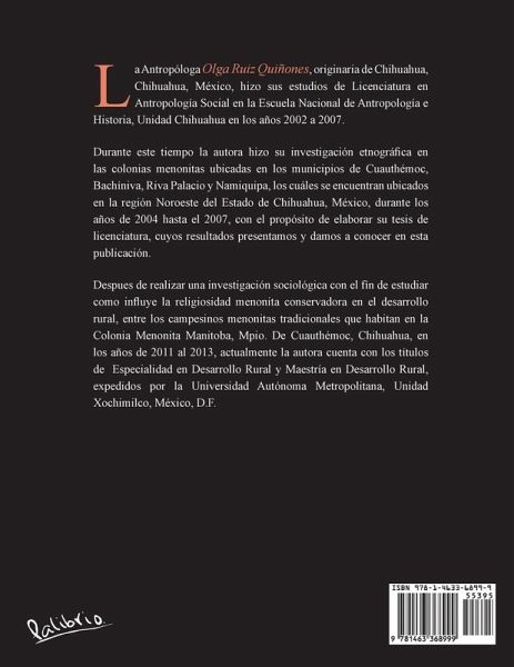 La Antropóloga Olga Ruiz Quiñones, originaria de Chihuahua, Chihuahua, México, hizo sus estudios de Licenciatura en Antropología Social en la Escuela Nacional de Antropología e Historia, Unidad Chihuahua en los años 2002 a 2007. Durante este tiempo la autora hizo su investigación etnográfica en las colonias menonitas ubicadas en los municipios de Cuauthémoc, Bachíniva, Riva Palacio y Namiquipa, los cuáles se encuentran ubicados en la región Noroeste del Estado de Chihuahua, México, durante los años de 2004 hasta el 2007, con el propósito de elaborar su tesis de licenciatura, cuyos resultados presentamos y damos a conocer en esta publicación. Despues de realizar una investigación sociológica con el fín de estudiar como influye la religiosidad menonita conservadora en el desarrollo rural, entre los campesinos menonitas tradicionales que habitan en la Colonia Menonita Manitoba, Mpio. De Cuauthémoc, Chihuahua, en los años de 2011 al 2013, actualmente la autora cuenta con los títulos de Especialidad en Desarrollo Rural y Maestría en Desarrollo Rural, expedidos por la Universidad Autónoma Metropolitana, Unidad Xochimilco, México, D.F.
