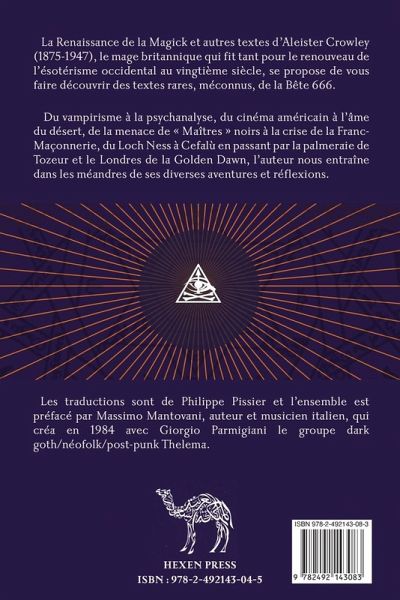 La Renaissance de la Magick & autres textes d'Aleister Crowley (1875-1947), le mage britannique qui fit tant pour le renouveau de l'ésotérisme occidental au vingtième siècle, se propose de vous faire découvrir des textes rares, méconnus, de la Bête 666. Du vampirisme à la psychanalyse, des messes noires de Kensington à la crise de la Franc-Maçonnerie, des phénomènes mystérieux du Loch Ness et du manoir de Boleskine aux inquiétantes peintures de la Chambre des Cauchemars de Cefalù, en passant par la palmeraie de Tozeur et le Londres de la Golden Dawn, l'auteur nous entraîne dans les méandres de ses diverses aventures et réflexions. Les traductions sont de Philippe Pissier et l'ensemble est préfacé par Massimo Mantovani, auteur et musicien italien, qui créa en 1984 avec Giorgio Parmigiani le groupe dark goth, néofolk, post-punk Thelema. "Parmi les premiers articles, nous découvrons trois perles : La Renaissance de la Magick est une description claire et précise d'une théorie et de pratiques magiques saines, Les Vraies Méthodes et les Fausses est un bref exposé des méthodes et critères usités dans l'A.'.A.'. de Crowley, cependant que L'Âme du Désert (rédigé à Tozeur) est une perspicace et astucieuse exploration des implications de la nature (l'âme) du désert, un lieu quasi parfait, d'après l'auteur, pour la méditation et l'avancement spirituel." - Extrait de la Préface de Massimo Mantovani