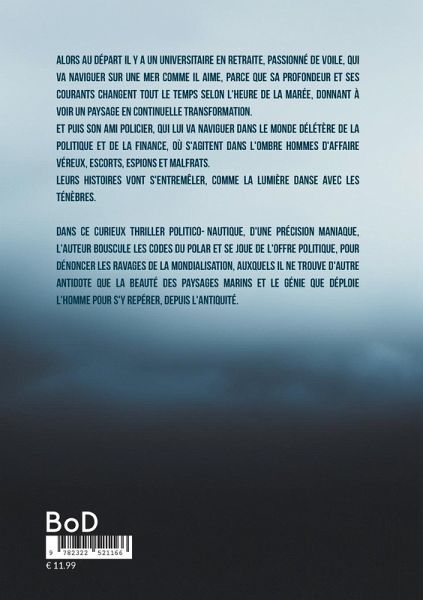 Alors au départ il y a un universitaire en retraite, passionné de voile, qui va naviguer sur une mer comme il aime, parce que sa profondeur et ses courants changent tout le temps selon l'heure de la marée, donnant à voir un paysage en continuelle transformation.Et puis son ami policier, qui lui va naviguer dans le monde délétère de la politique et de la finance, où s'agitent dans l'ombre hommes d'affaire véreux, escorts, espions et malfrats.Leurs histoires vont s'entremêler, comme la lumière danse avec les ténèbres.Dans ce curieux thriller politico-nautique, d'une précision maniaque, l'auteur bouscule les codes du polar et se joue de l'offre politique, pour dénoncer les ravages de la mondialisation, auxquels il ne trouve d'autre antidote que la beauté des paysages marins et le génie que déploie l'homme pour s'y repérer, depuis l'antiquité.