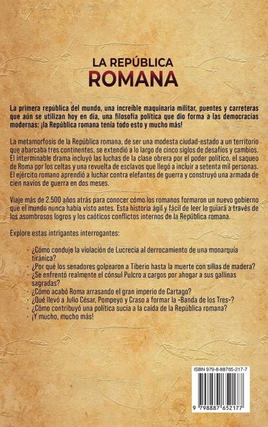 La primera república del mundo, una increíble maquinaria militar, puentes y carreteras que aún se utilizan hoy en día, una filosofía política que dio forma a las democracias modernas: ¡la República romana tenía todo esto y mucho más! La metamorfosis de la República romana, de ser una modesta ciudad-estado a un territorio que abarcaba tres continentes, se extendió a lo largo de cinco siglos de desafíos y cambios. El interminable drama incluyó las luchas de la clase obrera por el poder político, el saqueo de Roma por los celtas y una revuelta de esclavos que llegó a incluir a setenta mil personas. El ejército romano aprendió a luchar contra elefantes de guerra y construyó una armada de cien navíos de guerra en dos meses. Viaje más de 2.500 años atrás para conocer cómo los romanos formaron un nuevo gobierno que el mundo nunca había visto antes. Esta historia ágil y fácil de leer lo guiará a través de los asombrosos logros y los caóticos conflictos internos de la República romana. Explore estas intrigantes interrogantes: ¿Cómo condujo la violación de Lucrecia al derrocamiento de una monarquía tiránica? ¿Por qué los senadores golpearon a Tiberio hasta la muerte con sillas de madera? ¿Se enfrentó realmente el cónsul Pulcro a cargos por ahogar a sus gallinas sagradas? ¿Cómo acabó Roma arrasando el gran imperio de Cartago? ¿Qué llevó a Julio César, Pompeyo y Craso a formar la Banda de los Tres? ¿Cómo contribuyó una política sucia a la caída de la República romana? ¡Y mucho, mucho más!
