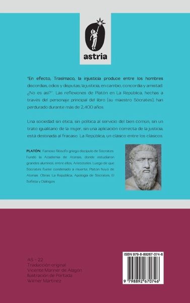 "En efecto, Trasímaco, la injusticia produce entre los hombres discordias, odios y disputas; la justicia, en cambio, concordia y amistad. ¿No es así?". Las reflexiones de Platón en La República, hechas a través del personaje principal del libro (su maestro Sócrates), han perdurado durante más de 2,400 años. Una sociedad sin ética, sin política al servicio del bien común, sin un trato igualitario de la mujer, sin una aplicación correcta de la justicia, está destinada al fracaso. La República, un clásico entre los clásicos.