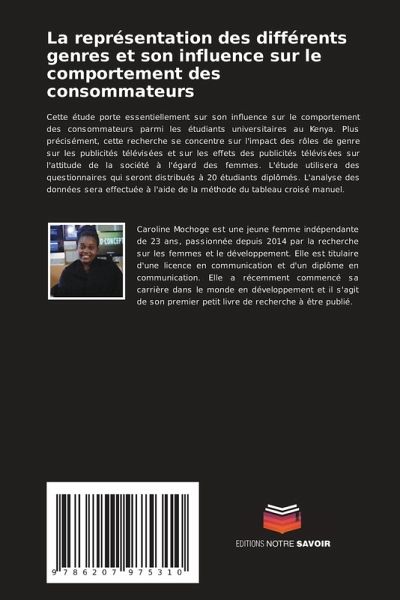 Cette étude porte essentiellement sur son influence sur le comportement des consommateurs parmi les étudiants universitaires au Kenya. Plus précisément, cette recherche se concentre sur l'impact des rôles de genre sur les publicités télévisées et sur les effets des publicités télévisées sur l'attitude de la société à l'égard des femmes. L'étude utilisera des questionnaires qui seront distribués à 20 étudiants diplômés. L'analyse des données sera effectuée à l'aide de la méthode du tableau croisé manuel.