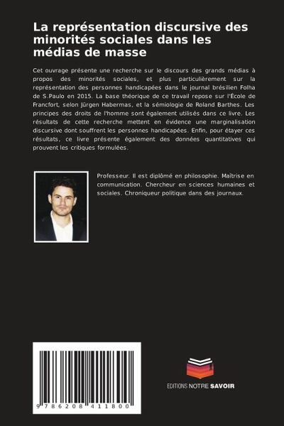 Cet ouvrage présente une recherche sur le discours des grands médias à propos des minorités sociales, et plus particulièrement sur la représentation des personnes handicapées dans le journal brésilien Folha de S.Paulo en 2015. La base théorique de ce travail repose sur l'École de Francfort, selon Jürgen Habermas, et la sémiologie de Roland Barthes. Les principes des droits de l'homme sont également utilisés dans ce livre. Les résultats de cette recherche mettent en évidence une marginalisation discursive dont souffrent les personnes handicapées. Enfin, pour étayer ces résultats, ce livre présente également des données quantitatives qui prouvent les critiques formulées.