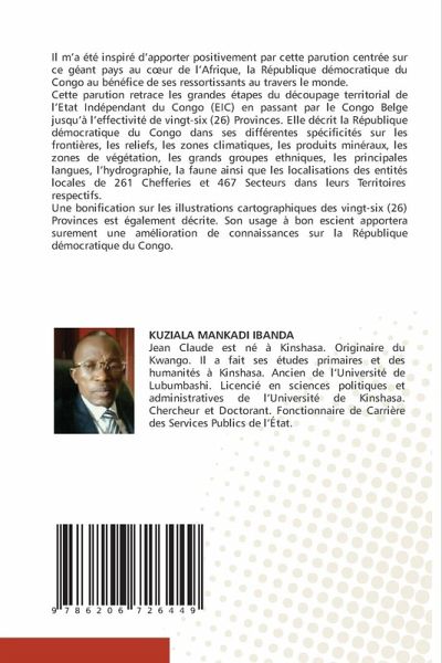Il m'a été inspiré d'apporter positivement par cette parution centrée sur ce géant pays au coeur de l'Afrique, la République démocratique du Congo au bénéfice de ses ressortissants au travers le monde.Cette parution retrace les grandes étapes du découpage territorial de l'Etat Indépendant du Congo (EIC) en passant par le Congo Belge jusqu'à l'effectivité de vingt-six (26) Provinces. Elle décrit la République démocratique du Congo dans ses différentes spécificités sur les frontières, les reliefs, les zones climatiques, les produits minéraux, les zones de végétation, les grands groupes ethniques, les principales langues, l'hydrographie, la faune ainsi que les localisations des entités locales de 261 Chefferies et 467 Secteurs dans leurs Territoires respectifs.Une bonification sur les illustrations cartographiques des vingt-six (26) Provinces est également décrite. Son usage à bon escient apportera surement une amélioration de connaissances sur la République démocratique du Congo.