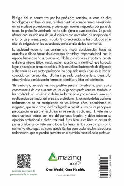 siglo XXI se caracteriza por los profundos cambios, muchos de ellos tecnológicos y también sociales, cambios que traen consigo nuevas necesidades en los modelos profesionales, y que exigen nuevas respuestas por parte de todos. La profesión veterinaria no ha sido ajena a estos cambios. Se puede afirmar que ha sido una de las disciplinas con necesidad de adaptación al entorno. La primera, y más importante consecuencia, se ha producido en el nivel de exigencia en las actuaciones profesionales de los veterinarios.La sociedad moderna trae consigo una mayor consideración hacia los animales; a ello se han unido el concepto de tutela y responsabilidad que la especie humana se ha autoimpuesto. Ello ha generado un importante debate a distintos niveles (ético, moral, social, económico y científico) que ha dado lugar a novedosas áreas de análisis. En la actualidad la demanda de diligencia y eficiencia de este sector profesional ha adquirido niveles que no se habían conocido con anterioridad. Ello ha impulsado positivamente su desarrollo, observándose cambios en la formación científica y ética del veterinario.Sin embargo, no todo ha sido positivo para el veterinario, pues como consecuencia de ese aumento de las exigencias profesionales, también se ha producido un incremento de las reclamaciones por supuestos errores o negligencias derivados del ejercicio profesional. El aumento de las acciones reclamatorias se ha multiplicado en los últimos años, adquiriendo tal magnitud, que en la actualidad ha llegado a constituir una de las principales preocupaciones para el facultativo en su ejercicio cotidiano. El veterinario debe conocer cuáles son sus obligaciones legales, y debe adaptar su ejercicio profesional a dicha realidad. Pues bien, este libro se ocupa de poner al alcance del veterinario todas las herramientas para cumplir con la normativa ético-legal, así como ayuda técnica para poder resolver situaciones reclamatorias que se pueden presentar en el ejercicio habitual de la profesión.