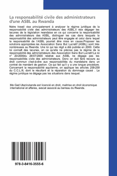 Notre travail vise principalement à analyser le régime juridique de la responsabilité civile des administrateurs des ASBL.Il vise dégager les lacunes de la législation rwandaise en ce qui concerne la responsabilité des administrateurs des ASBL, distinguer les cas dans lesquels la responsabilité des administrateurs peut être engagée et celui dans lequel la responsabilité de l'ASBL pourrait être mise en cause.Proposer les solutions appropriées.les Association Sans But Lucratif (ASBL) sont très nombreuses au Rwanda. Une loi qui les régit a été publiée en 2000. Cette loi connaît des lacunes, en ce qu'elle ne précise pas le régime de la responsabilité des administrateurs des Association Sans But Lucratif.La loi n° 20/2000du 26/07/2000 relative aux ASBL ne dégage pas les responsabilités civile des administrateurs. Donc on doit faire recours au droit commun c'est-à-dire aux responsabilités du mandataire dans un contrat de mandant de gestion. Ce qui fait qu'il y a une longue procédure. Concernant la responsabilité aquilienne, on applique les articles 258-259 du C.C.L.III, dont le résultant et la réparation du dommage causé . Le régime juridique ne dégage pas les situations dans lesquel.