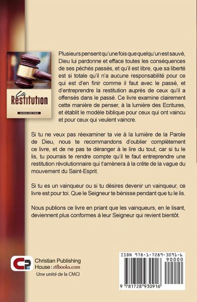 Plusieurs pensent qu’une fois que quelqu’un est sauvé, Dieu lui pardonne et efface toutes les conséquences de ses péchés passés, et qu’il est libre, que sa liberté est si totale qu’il n’a aucune responsabilité pour ce qui est d’en finir comme il faut avec le passé, et d’entreprendre la restitution auprès de ceux qu’il a offensés dans le passé. Ce livre examine clairement cette manière de penser, à la lumière des Ecritures, et établit le modèle biblique pour ceux qui ont vaincu et pour ceux qui veulent vaincre. Si tu ne veux pas réexaminer ta vie à la lumière de la Parole de Dieu, nous te recommandons d’oublier complètement ce livre, et de ne pas te déranger à le lire du tout, car si tu le lis, tu pourrais te rendre compte qu’il te faut entreprendre une restitution révolutionnaire qui t’amènera à la crête de la vague du mouvement du Saint-Esprit. Si tu es un vainqueur ou si tu désires devenir un vainqueur, ce livre est pour toi. Que le Seigneur te bénisse pendant que tu le lis. Nous publions ce livre en priant que les vainqueurs, en le lisant, deviennent plus conformes à leur Seigneur qui revient bientôt.