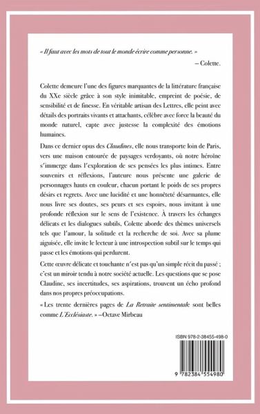 Il faut avec les mots de tout le monde écrire comme personne. - Colette.Colette demeure l'une des figures marquantes de la littérature française du XXe siècle grâce à son style inimitable, empreint de poésie, de sensibilité et de finesse. En véritable artisan des Lettres, elle peint avec détails des portraits vivants et attachants, célèbre avec force la beauté du monde naturel, capte avec justesse la complexité des émotions humaines. Dans ce dernier opus des Claudines, elle nous transporte loin de Paris, vers une maison entourée de paysages verdoyants, où notre héroïne s'immerge dans l'exploration de ses pensées les plus intimes. Entre souvenirs et réflexions, l'auteure nous présente une galerie de personnages hauts en couleur, chacun portant le poids de ses propres désirs et regrets. Avec une lucidité et une honnêteté désarmantes, elle nous livre ses doutes, ses peurs et ses espoirs, nous invitant à une profonde réflexion sur le sens de l'existence. À travers les échanges délicats et les dialogues subtils, Colette aborde des thèmes universels tels que l'amour, la solitude et la recherche de soi. Avec sa plume aiguisée, elle invite le lecteur à une introspection subtil sur le temps qui passe et les émotions qui perdurent.Cette uvre délicate et touchante n'est pas qu'un simple récit du passé ; c'est un miroir tendu à notre société actuelle. Les questions que se pose Claudine, ses incertitudes, ses aspirations, trouvent un écho profond dans nos propres préoccupations. Les trente dernières pages de La Retraite sentimentale sont belles comme L'Ecclésiaste. -Octave Mirbeau