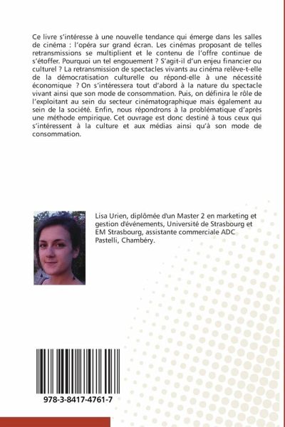 Ce livre s'intéresse à une nouvelle tendance qui émerge dans les salles de cinéma : l'opéra sur grand écran. Les cinémas proposant de telles retransmissions se multiplient et le contenu de l'offre continue de s'étoffer. Pourquoi un tel engouement ? S'agit-il d'un enjeu financier ou culturel ? La retransmission de spectacles vivants au cinéma relève-t-elle de la démocratisation culturelle ou répond-elle à une nécessité économique ? On s'intéressera tout d'abord à la nature du spectacle vivant ainsi que son mode de consommation. Puis, on définira le rôle de l'exploitant au sein du secteur cinématographique mais également au sein de la société. Enfin, nous répondrons à la problématique d'après une méthode empirique. Cet ouvrage est donc destiné à tous ceux qui s'intéressent à la culture et aux médias ainsi qu'à son mode de consommation.