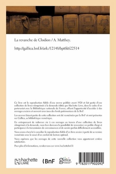 La revanche de Clodion / A. Matthey. Date de l'édition originale: 1882 Le présent ouvrage s'inscrit dans une politique de conservation patrimoniale des ouvrages de la littérature Française mise en place avec la BNF. HACHETTE LIVRE et la BNF proposent ainsi un catalogue de titres indisponibles, la BNF ayant numérisé ces oeuvres et HACHETTE LIVRE les imprimant à la demande. Certains de ces ouvrages reflètent des courants de pensée caractéristiques de leur époque, mais qui seraient aujourd'hui jugés condamnables. Ils n'en appartiennent pas moins à l'histoire des idées en France et sont susceptibles de présenter un intérêt scientifique ou historique. Le sens de notre démarche éditoriale consiste ainsi à permettre l'accès à ces oeuvres sans pour autant que nous en cautionnions en aucune façon le contenu. Pour plus d'informations, rendez-vous sur www.hachettebnf.fr