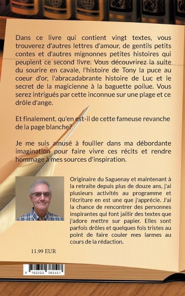 Dans ce livre qui contient vingt textes, vous trouverez d'autres lettres d'amour, de gentils petits contes et d'autres mignonnes petites histoires qui peuplent ce second livre. Vous découvrirez la suite du sourire en cavale, l'histoire de Tony la puce au coeur d'or, l'abracadabrante histoire de Luc et le secret de la magicienne à la baguette poilue. Vous serez intrigués par cette inconnue sur une plage et ce drôle d'ange. Et finalement, qu'en est-il de cette fameuse revanche de la page blanche?Je me suis amusé à fouiller dans ma débordante imagination pour faire vivre ces récits et rendre hommage à mes sources d'inspiration.