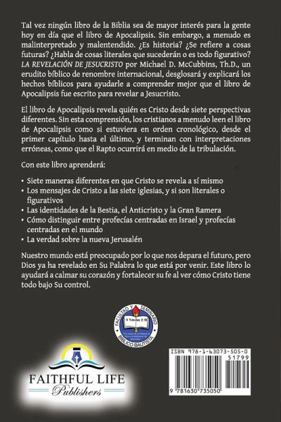 Tal vez ningún libro de la Biblia sea de mayor interés para la gente hoy en día que el libro de Apocalipsis. Sin embargo, a menudo es malinterpretado y malentendido. ¿Es historia? ¿Se refiere a cosas futuras? ¿Habla de cosas literales que sucederán o es todo figurativo? LA REVELACIÓN DE JESUCRISTO por Michael D. McCubbins, Th.D., un erudito bíblico de renombre internacional, desglosará y explicará los hechos bíblicos para ayudarle a comprender mejor que el libro de Apocalipsis fue escrito para revelar a Jesucristo. El libro de Apocalipsis revela quién es Cristo desde siete perspectivas diferentes. Sin esta comprensión, los cristianos a menudo leen el libro de Apocalipsis como si estuviera en orden cronológico, desde el primer capítulo hasta el último, y terminan con interpretaciones erróneas, como que el Rapto ocurrirá en medio de la tribulación. Con este libro aprenderá: ¿Siete maneras diferentes en que Cristo se revela a sí mismo ¿Los mensajes de Cristo a las siete iglesias, y si son literales o figurativos ¿Las identidades de la Bestia, el Anticristo y la Gran Ramera ¿Cómo distinguir entre profecías centradas en Israel y profecías centradas en el mundo ¿La verdad sobre la nueva Jerusalén Nuestro mundo está preocupado por lo que nos depara el futuro, pero Dios ya ha revelado en Su Palabra lo que está por venir. Este libro lo ayudará a calmar su corazón y fortalecer su fe al ver cómo Cristo tiene todo bajo Su control.