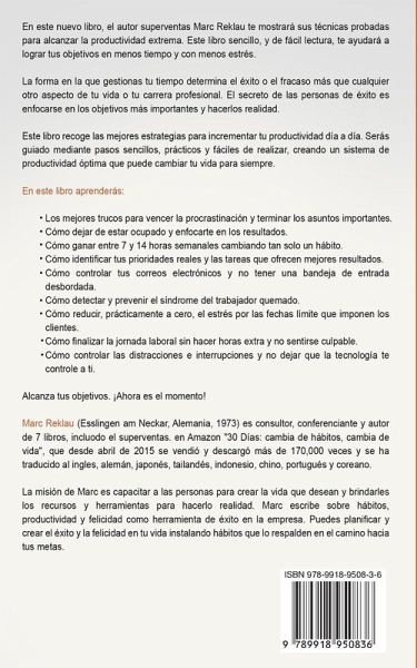 ¡Los mejores hábitos para ser más productivo y gestionar bien tu tiempo! ¿Estás disfrutando tu vida a tope o vas siempre como un pollo sin cabeza?¿Controlas tu día o tu día te controla a ti?¿Sabes que la mala gestión de tiempo afecta tu autoestima, tus relaciones y tu calidad de vida?¿Quieres ser más productivo en tu trabajo y por fin cumplir tus tareas a tiempo? En este nuevo libro, el autor superventas Marc Reklau, te mostrará sus mejores técnicas probadas para alcanzar mejor productividad. Este libro sencillo, y de fácil lectura, te ayudará a lograr tus objetivos en menos tiempo, con menos estrés y te ayudará a encontrar más tiempo para ti y los tuyos. No nos engañemos - la forma en la que gestionas tu tiempo determina el éxito o el fracaso más que cualquier otro aspecto de tu vida o tu carrera profesional. El secreto de las personas de éxito es enfocarse en los objetivos más importantes y hacerlos realidad. Este libro recoge las mejores estrategias para incrementar tu productividad día a día. Serás guiado mediante pasos sencillos, prácticos y fáciles de realizar, creando un sistema de productividad óptima que puede cambiar tu vida para siempre. ¡Aplicables desde el minuto cero! Independiente de tus circunstancias, tu edad o tu profesión. En este libro aprenderás:Los mejores trucos para vencer la procrastinación y terminar los asuntos importantes. Cómo dejar de estar ocupado y enfocarte en los resultados. Cómo ganar entre 7 y 14 horas semanales cambiando tan solo un hábito. Cómo identificar tus prioridades reales y las tareas que ofrecen mejores resultados. Cómo controlar tus correos electrónicos y no tener una bandeja de entrada desbordada. Cómo detectar y prevenir el síndrome del trabajador quemado. Cómo reducir, prácticamente a cero, el estrés por las fechas límite que imponen los clientes. Cómo finalizar la jornada laboral sin hacer horas extra y ni siquiera sentirte culpable. Cómo controlar las distracciones e interrupciones y no dejar que la tecnología te controle a ti. Cumple tus objetivos y gestiona tu tiempo. ¡Ahora es el momento!