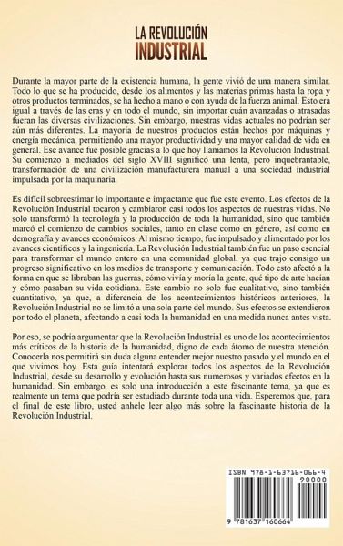 Descubra la fascinante historia de la Revolución Industrial Durante la mayor parte de la existencia humana, la gente vivió de una manera similar. Todo lo que se ha producido, desde los alimentos y las materias primas hasta la ropa y otros productos terminados, se ha hecho a mano o con ayuda de la fuerza animal. Esto era igual a través de las eras y en todo el mundo, sin importar cuán avanzadas o atrasadas fueran las diversas civilizaciones. Sin embargo, nuestras vidas actuales no podrían ser aún más diferentes. La mayoría de nuestros productos están hechos por máquinas y energía mecánica, permitiendo una mayor productividad y una mayor calidad de vida en general. Ese avance fue posible gracias a lo que hoy llamamos la Revolución Industrial. Su comienzo a mediados del siglo XVIII significó una lenta, pero inquebrantable, transformación de una civilización manufacturera manual a una sociedad industrial impulsada por la maquinaria. Es difícil sobreestimar lo importante e impactante que fue este evento. Los efectos de la Revolución Industrial tocaron y cambiaron casi todos los aspectos de nuestras vidas. No solo transformó la tecnología y la producción de toda la humanidad, sino que también marcó el comienzo de cambios sociales, tanto en clase como en género, así como en demografía y avances económicos. Al mismo tiempo, fue impulsado y alimentado por los avances científicos y la ingeniería. La Revolución Industrial también fue un paso esencial para transformar el mundo entero en una comunidad global, ya que trajo consigo un progreso significativo en los medios de transporte y comunicación. Todo esto afectó a la forma en que se libraban las guerras, cómo vivía y moría la gente, qué tipo de arte hacían y cómo pasaban su vida cotidiana. Este cambio no solo fue cualitativo, sino también cuantitativo, ya que a diferencia de los acontecimientos históricos anteriores, la Revolución Industrial no se limitó a una sola parte del mundo. Sus efectos se extendieron por todo el planeta, afectando a casi toda la humanidad en una medida nunca antes vista. Por eso, se podría argumentar que la Revolución Industrial es uno de los acontecimientos más críticos de la historia de la humanidad, digno de cada átomo de nuestra atención. Conocerla nos permitirá sin duda alguna entender mejor nuestro pasado y el mundo en el que vivimos hoy. Esta guía intentará explorar todos los aspectos de la Revolución Industrial, desde su desarrollo y evolución hasta sus numerosos y variados efectos en la humanidad. En La Revolución Industrial: Una guía fascinante de un período de gran industrialización y la introducción de la hilatura Jenny, la ginebra de algodón, la electricidad y otros inventos, descubrirá temas como:Nacimiento de la Revolución Los motores británicos comienzan a rodar Los engranajes de la revolución Difusión del cambio Chispas de una nueva revolución Efectos de la transformación ¡Y mucho, mucho más! ¡Obtenga este libro ahora para aprender más sobre la revolución industrial!