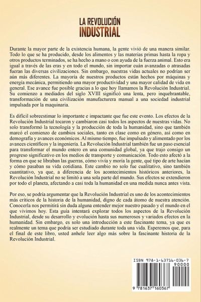 Descubra la fascinante historia de la Revolución Industrial Durante la mayor parte de la existencia humana, la gente vivió de una manera similar. Todo lo que se ha producido, desde los alimentos y las materias primas hasta la ropa y otros productos terminados, se ha hecho a mano o con ayuda de la fuerza animal. Esto era igual a través de las eras y en todo el mundo, sin importar cuán avanzadas o atrasadas fueran las diversas civilizaciones. Sin embargo, nuestras vidas actuales no podrían ser aún más diferentes. La mayoría de nuestros productos están hechos por máquinas y energía mecánica, permitiendo una mayor productividad y una mayor calidad de vida en general. Ese avance fue posible gracias a lo que hoy llamamos la Revolución Industrial. Su comienzo a mediados del siglo XVIII significó una lenta, pero inquebrantable, transformación de una civilización manufacturera manual a una sociedad industrial impulsada por la maquinaria. Es difícil sobreestimar lo importante e impactante que fue este evento. Los efectos de la Revolución Industrial tocaron y cambiaron casi todos los aspectos de nuestras vidas. No solo transformó la tecnología y la producción de toda la humanidad, sino que también marcó el comienzo de cambios sociales, tanto en clase como en género, así como en demografía y avances económicos. Al mismo tiempo, fue impulsado y alimentado por los avances científicos y la ingeniería. La Revolución Industrial también fue un paso esencial para transformar el mundo entero en una comunidad global, ya que trajo consigo un progreso significativo en los medios de transporte y comunicación. Todo esto afectó a la forma en que se libraban las guerras, cómo vivía y moría la gente, qué tipo de arte hacían y cómo pasaban su vida cotidiana. Este cambio no solo fue cualitativo, sino también cuantitativo, ya que a diferencia de los acontecimientos históricos anteriores, la Revolución Industrial no se limitó a una sola parte del mundo. Sus efectos se extendieron por todo el planeta, afectando a casi toda la humanidad en una medida nunca antes vista. Por eso, se podría argumentar que la Revolución Industrial es uno de los acontecimientos más críticos de la historia de la humanidad, digno de cada átomo de nuestra atención. Conocerla nos permitirá sin duda alguna entender mejor nuestro pasado y el mundo en el que vivimos hoy. Esta guía intentará explorar todos los aspectos de la Revolución Industrial, desde su desarrollo y evolución hasta sus numerosos y variados efectos en la humanidad. En La Revolución Industrial: Una guía fascinante de un período de gran industrialización y la introducción de la hilatura Jenny, la ginebra de algodón, la electricidad y otros inventos, descubrirá temas como:Nacimiento de la Revolución Los motores británicos comienzan a rodar Los engranajes de la revolución Difusión del cambio Chispas de una nueva revolución Efectos de la transformación ¡Y mucho, mucho más! ¡Obtenga este libro ahora para aprender más sobre la revolución industrial!