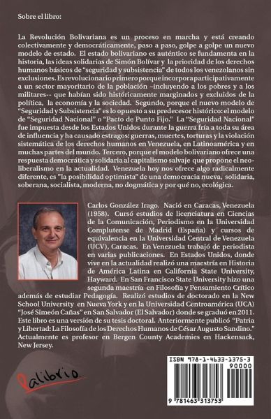 Sobre el libro: La Revolución Bolivariana es un proceso en marcha y está creando colectivamente y democráticamente, paso a paso, golpe a golpe un nuevo modelo de estado. El estado bolivariano es auténtico se fundamenta en la historia, las ideas solidarias de Simón Bolívar y la prioridad de los derechos humanos básicos de "seguridad y subsistencia" de todos los venezolanos sin exclusiones. Es revolucionario primero porque incorpora participativamente a un sector mayoritario de la población -incluyendo a los pobres y a los militares-- que habían sido históricamente marginados y excluidos de la política, la economía y la sociedad. Segundo, porque el nuevo modelo de "Seguridad y Subsistencia" es lo opuesto a su predecesor histórico: el modelo de "Seguridad Nacional" o "Pacto de Punto Fijo." La "Seguridad Nacional" fue impuesta desde los Estados Unidos durante la guerra fría a toda su área de influencia y ha causado estragos: guerras, muertes, torturas y la violación sistemática de los derechos humanos en Venezuela, en Latinoamérica y en muchas partes del mundo. Tercero, porque el modelo bolivariano ofrece una respuesta democrática y solidaria al capitalismo salvaje que propone el neo-liberalismo en la actualidad. Venezuela hoy nos ofrece algo radicalmente diferente, es "la posibilidad optimista" de una democracia nueva, solidaria, soberana, socialista, moderna, no dogmática y por qué no, ecológica.