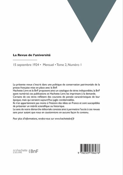 La Revue de l'université organe de la vie universitaire, littéraire, artistique et scientifique internationale / directeur Maurice Levet; secrétaire de la rédaction René Jolivet Date de l'édition originale: 1924-09-15 La présente revue s'inscrit dans une politique de conservation patrimoniale de la presse française mise en place avec la BnF. Hachette Livre et la BnF proposent ainsi un catalogue de titres indisponibles, la BnF ayant numérisé ces publications et Hachette Livre les imprimant à la demande. Certains de ces titres reflètent des courants de pensée caractéristiques de leur époque, mais qui seraient aujourd'hui jugés condamnables. Ils n'en appartiennent pas moins à l'histoire des idées en France et sont susceptibles de présenter un intérêt scientifique ou historique. Le sens de notre démarche éditoriale consiste ainsi à permettre l'accès à ces revues sans pour autant que nous en cautionnions en aucune façon le contenu. Pour plus d'informations, rendez-vous sur www.hachettebnf.fr