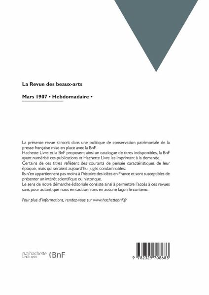 La Revue des beaux-arts: peinture, sculpture, architecture, gravure, musique, renseignements artistiques, expositions, concours: gazette hebdomadaire fondée en 1830 / dir. Henri Revers Date de l'édition originale: 1907-03 La présente revue s'inscrit dans une politique de conservation patrimoniale de la presse française mise en place avec la BnF. Hachette Livre et la BnF proposent ainsi un catalogue de titres indisponibles, la BnF ayant numérisé ces publications et Hachette Livre les imprimant à la demande. Certains de ces titres reflètent des courants de pensée caractéristiques de leur époque, mais qui seraient aujourd'hui jugés condamnables. Ils n'en appartiennent pas moins à l'histoire des idées en France et sont susceptibles de présenter un intérêt scientifique ou historique. Le sens de notre démarche éditoriale consiste ainsi à permettre l'accès à ces revues sans pour autant que nous en cautionnions en aucune façon le contenu. Pour plus d'informations, rendez-vous sur www.hachettebnf.fr