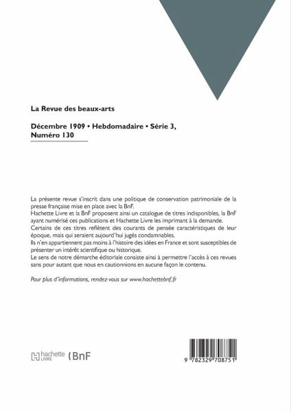 La Revue des beaux-arts: peinture, sculpture, architecture, gravure, musique, renseignements artistiques, expositions, concours: gazette hebdomadaire fondée en 1830 / dir. Henri Revers Date de l'édition originale: 1909-12 La présente revue s'inscrit dans une politique de conservation patrimoniale de la presse française mise en place avec la BnF. Hachette Livre et la BnF proposent ainsi un catalogue de titres indisponibles, la BnF ayant numérisé ces publications et Hachette Livre les imprimant à la demande. Certains de ces titres reflètent des courants de pensée caractéristiques de leur époque, mais qui seraient aujourd'hui jugés condamnables. Ils n'en appartiennent pas moins à l'histoire des idées en France et sont susceptibles de présenter un intérêt scientifique ou historique. Le sens de notre démarche éditoriale consiste ainsi à permettre l'accès à ces revues sans pour autant que nous en cautionnions en aucune façon le contenu. Pour plus d'informations, rendez-vous sur www.hachettebnf.fr
